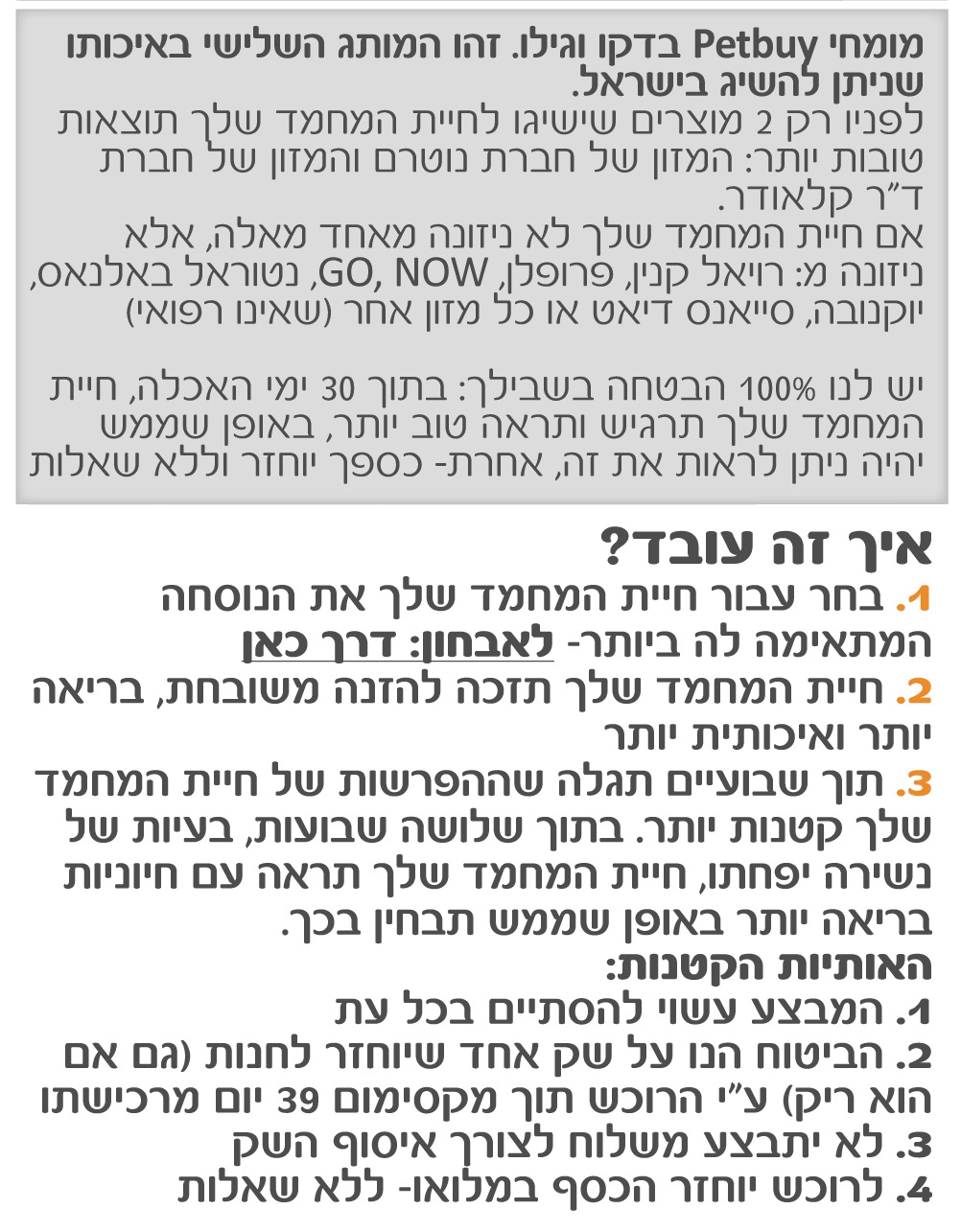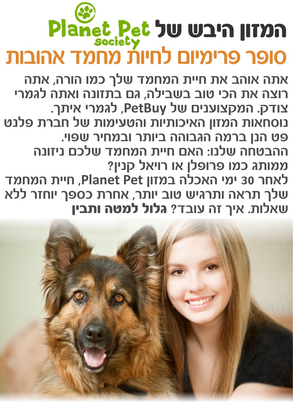 מוצרים לבעלי חיים וציוד לבעלי חיים באתר של PetBuy. מחירי הפרוטקציה המיוחדים שלנו יחשפו בפניך לאחר הרשמה בלבד! פטביי הנו אתר מזון ומוצרים לבעלי חיים. עבור בעלי חיים ואוהבי בעלי חיים ,PetBuy מפגיש בין חיות לבין אוהבי חיות וגם בין וטרינרים, דוג ווקרים, ספרי כלבים וכל בעל מקצוע שדרוש לבעל החיים שלך אצלנו תמצאו מזון לכלבים, מזון לחתולים ובעצם מזון לכל סוגי החיות. PetBuy הוא לא עוד אתר לחיות מחמד, אלא פורטל לבעלי חיים המכיל גם רשת חברתית לאוהבי בעלי חיים ובעצם רשת חברתית לחיות עצמן. ברשת החברתית לבעלי חיים של PetBuy (PetBuyBOOK) תוכלו למצוא לחיית המחמד שלכם שידוך וגם שידוך לעצמכם של אוהב/ת חיות. כמו כן תוכלו למצוא ב פט ביי וטרינר, מאלף, ספר כלבים, פנסיון וכל בעל מקצוע אחר שהצטרף ל PetBuyBOOK. הצטרפו ל PetBuyBOOK ההרשמה והשימוש ברשת החברתית של אוהבי החיות: חינם! בנוסף אנו גאים להציג את מרכז האימוצים הארצי, בו תוכלו לאמץ לעצמכם כלב או חתול מאחת מעמותות האימוץ בארץ. מרכז האימוצים הוא אתר למי שמחפש לאמץ לעצמו חיית מחמד בצורה נוחה ומהירה. פט ביי היא רשת חיות חכמה בהתאמה אישית לחיות מחמד. המוטו שלנו: לכל חיית מחמד מגיע יחס מיוחד.יחס מיוחד זה למשל לפתח רשת חברתית בשביל החיה שלך, להכיר אותה בשם ובצרכים המיוחדים שלה ולהסב לה ולך אושר.