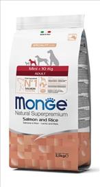 מזון לכלבים מבית חברת Monge. המזון מתאים לכלבים בוגרים השייכים לגזעים הקטנים. האוכל מכיל סלמון המועשר בחלבונים ובאורז לעיכול טוב יותר של המזון. בנוסף, המזון מכיל תמצית ארטישוק ושום לתפקוד טוב יותר של המערכת החיסונית