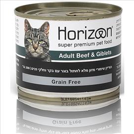Horzion הורייזון -מזון רטוב (שימור) לחתולים בוגרים בטעם בקר וחלקי פנים (adult beef & giblets) שימורי פטה איכותיים לחתולים בוגרים מעל גיל שנה 200 גרם באריזה. בטעם בקר וחלקי פנים. רכיבים: בשר ומוצרי בשר (26% בקר) (4% לבבות עוף),מינרלים, רטיבות 79%, חלבון גולמי 10.5%,שמן גלמי 6% , אפר גלמי 2.1%,תאית גלמית 0.2%, סידן 0.3%, זרחן 0.24%.