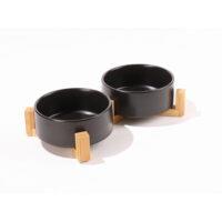 מעמד סטנד עץ במבוק מעוצב בשילוב זוג קערות קרמיקה למזון ומים 350 מ"ל